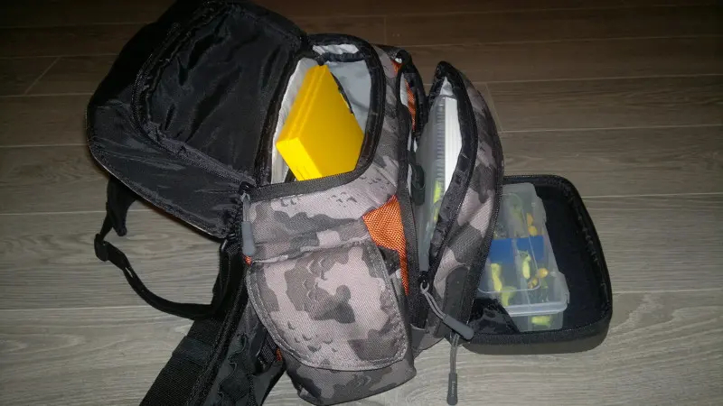 - встроенные карманы для емкостей для воды или коробок с мушками/приманками на каждой стороне пояса;